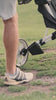 Scrubi golf club cleaner attached to a golf bag, 3-wheel Clicgear and golf cart featuring durable bristles for effective club cleaning on the course